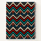 This is a decorative wolf face made by hand and stylised with Aztec patterns in black, red, turquoise and beige colours.