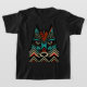 This is a decorative wolf face made by hand and stylised with Aztec patterns in black, red, turquoise and beige colours.