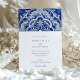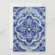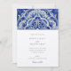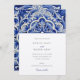 This sophisticated wedding invitation features a prominent, classic ceramic tile design with a beautiful floral motif. The design showcases a deep cobalt blue and white colour scheme, reminiscent of traditional azulejo pottery. The intricate pattern is composed of elegant swirling florals and leaves, creating a lavish and timeless look perfect for any formal event. The invitation is completed with a clean, crisp white background that allows the blue ornamental design to truly stand out, making it a memorable announcement for your special day.