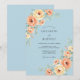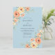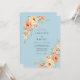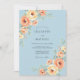 This design features a soft sky blue backdrop adorned with delicate watercolor blooms in shades of peach, apricot, and pale yellow. Lush roses and airy ranunculus create a romantic border, complemented by soft sage green foliage. The aesthetic is light and whimsical, perfect for a breezy seasonal event. The painterly style provides an elegant and timeless botanical feel.