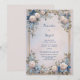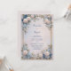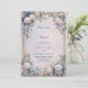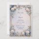 Surround your special announcement with the opulent beauty of this symmetrical botanical layout. The corners are anchored by lush cream rose blossom clusters and delicate periwinkle blue bloom sprays. Striking azure blue leaf accents weave through traditional green foliage, creating a vibrant contrast within a sophisticated double gold frame. The entire composition floats over a soft, ethereal gradient background of blush pink and pale lavender for a romantic, high-end feel. This wedding invitation is a premier choice for a grand estate ceremony, an elegant garden gala, or a sophisticated spring celebration. It ensures your event details are presented with a sense of timeless luxury and organic grace from the moment guests open the envelope.