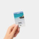 Name badge with a beautiful photograph. A white sandy beach, with a gentle surf. Tropical turquoise water surrounds a jagged rock.