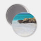 Magnet with a beautiful photograph. A white sandy beach, with a gentle surf. Tropical turquoise water surrounds a jagged rock.