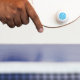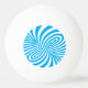 A professional white table tennis ball featuring a unique, light-blue geometric swirl pattern that creates a fluid, kinetic visual effect. The ball is perfectly centered on a blue table tennis court with a soft-focus net in the background, highlighting the intersection of athletic precision and modern graphic branding.