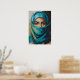 The artist's hand is evident in every impasto mark, creating a tactile surface that emphasizes the movement of the fabric and the contours of her face. The colour palette is dominated by a stunning array of blues and teals in the head covering, ranging from deep indigos to bright turquoises, which beautifully contrast with the warm, earthy tones of her skin. Hints of golden ochre and creamy beige swirl in the background, adding to the energetic and expressive quality of the piece, creating a sense of a halo or an aura around her.