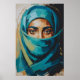 This captivating abstract expressionist portrait is a vibrant celebration of female strength and cultural beauty. The subject, a woman with piercing blue eyes, is framed by a dynamically rendered head covering that flows with rich textures and bold, confident brushstrokes.