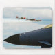 A squadron of World War II war bird fighter planes trail smoke in a salute to the Air Force B-1B Lancer Bomber of today, in this air show demonstration.