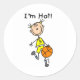 A girl stick figure basketball player drives the ball up the court on basketball theme T-shirts, cards, mugs, mousepads, and other basketball player gifts and apparel. Text reads "I'm Hot!"