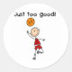 A stick figure boy basketball player in a red jersey playing basketball and text that reads "Just Too Good!" is featured on basketball player T-shirts, mugs, mousepads, tote bags, and more!