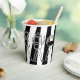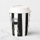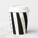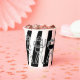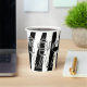 Introducing this stylish Black and White Striped Takeaway Coffee Paper Cup, featuring three eye-catching characters - a coffee maker, teapot, and glass pitcher. The entire graphic design is presented in black and white, creating a timeless and sophisticated look. The company name and additional text to personalised are beautifully accentuated in Vegas Gold, adding a touch of glamour to the overall aesthetic.