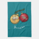 A kitchen towel or tea towel for the Christmas season, featuring a cartoon of two baubles on a Christmas tree branch; one gold and shiny with a baaing sheep, the other red and sparkling with a humbug sweet, to make the phrase "baa humbug" in pictures. Change the default text beneath the Xmas decorations to your preferred message or caption.