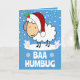 An adorable card for those that are a little grumpy over the holiday season. A cute cartoon sheep wearing a red and white Santa hat standing out in the snow on a blue background. Below her are the words "BAA HUMBUG" in a fun white font.