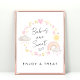 Cute whimsical boho baby girl shower take a treat poster sign featuring pastel pink and yellow watercolors of a rainbow, sun, hearts, stars, moons and clouds and "Babies are Sweet" in a stylish calligraphy script.