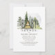 Illustration of rustic a frame house surrounded by trees. Opposite side is wood inspired design.