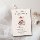 An enchanting watercolor illustration featuring a pair of baby ballerina shoes hanging from a pink bow, painted in watercolor with gold glitter accents (these are digital effects, not real foil) decorates this elegant and adorable baby girl shower invitation. Perfect for a ballet themed baby girl shower invitation, for a mum who loves the little ballerina idea or loves ballet herself.