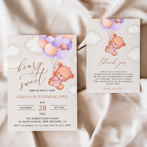 Baby Bear, Purple Balloons, First Birthday Thank You Card