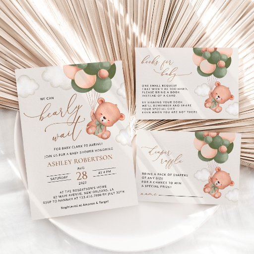 Add a personal touch to your baby shower celebration with these stylish and memorable party items! Design features baby bear with green balloons on beige background.