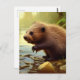 A postcard for wildlife lovers, featuring an AI generated realistic digital painting of a cute baby beaver playing in a mountain stream.