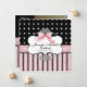 This Birth Announcement features elegant French copperplate swirls, pink and green dots on a black background, hand painted ruffled fabric background, border and a beautiful hand painted pink silk bow. All made from original artwork by Audrey Jeanne Roberts. The result is a beautifully contemporary Baby ensemble. On the reverse side there is the same dot pattern and a bracket revealing a place for your baby's photo. You can easily add your own picture or change the message. YOU MIGHT ALSO ENJOY: