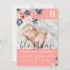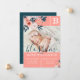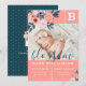 Introduce the birth of your beautiful baby girl to your family and friends with this beautiful, stylish and elegant photo birth announcement card featuring the baby photo framed with beautiful pink flowers and deep blue teal leaves that beautifully frame the edge and gently cascade over the photo. The card is designed in a colour palette of pinks, deep teal blue greens. The baby girl birth announcement features the first name initial on the front and back, which is designed in a square to represent a child's baby letter block. Baby's name displayed in a large script handwriting font placed over the baby photo. The reverse side features a a baby block monogram design with pink watercolor flowers and deep teal green background with pale pink polka dot pattern that complement the front artwork. All illustrations contained in this beautiful elegant floral monogram baby girl birth announcement card are hand-drawn original artwork by Moodthology. You can customise the text size, text colour, font and layout for your own personal design preference.