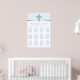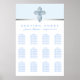 Boys blue baptism table seating chart with baby blue dots and silver grey stripe with pretty blue cross on a white background. You can change the background colour and remove or move the cross as needed for your event.