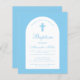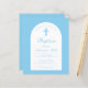 A modern baptism invitation. On a baby blue background, it has a white arch with blue text inside. The word Baptism and the name are written in an elegant calligraphic script; the first line is arched text.