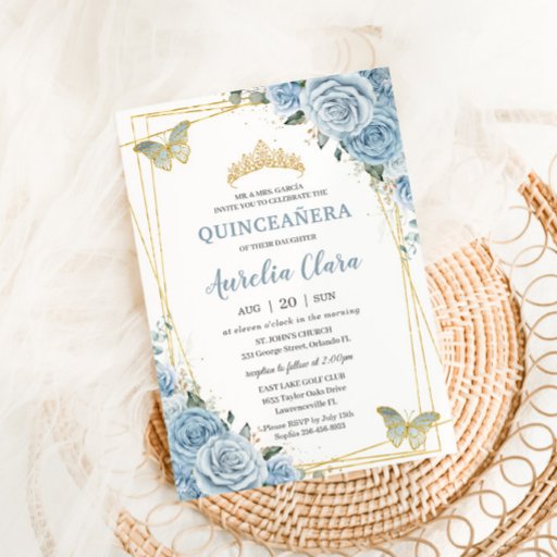 Soft Baby Blue Floral Gold Quinceanera BirthdayDesigned by The Happy Cat Studio