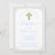 Elegant baby blue and gold baptism invitations with beautiful gold cross on a baby blue dot and gold border background. This boy baptism invitation is easily customised for your event by adding your details. You can remove the blue pearl from the cross if you prefer.