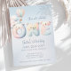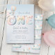 This adorable invitation features the word “ONE” illustrated with sweet bear faces and a whimsical hot air balloon, creating a magical and gentle vibe perfect for a little one’s big milestone. Set against a light sky blue background.
