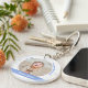 Trendy, classy personalised new baby boy keychain with a white frame with a round opening for a custom horizontal photo, and a curved blue band on each side on which appears the name or names and date of birth of the little boy in an elegant script font / typography. Note that you can choose to buy this keychain single-sided. This design includes the words "I love you, Grandma Johanna!", which you can personalise or delete. It also includes a circle of white and silver snowflakes and stars.