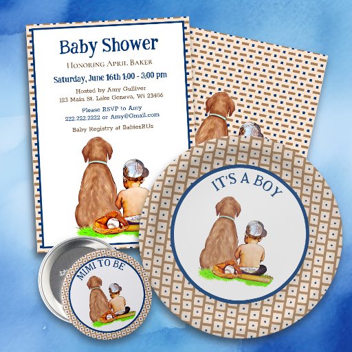 Brown and Blue personalised boy's baby shower stickers with a baby boy sitting next to a dog with a baseball theme.