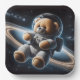 Teddy bear astronaut floating in outer space by Saturn rings for new baby boy shower.