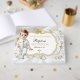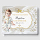 Beautiful baby in christening outfit. Background is white satin with a gold and silver glitter frame and bow embellishment. Back is adorned with gold ribbon on a white satin background.