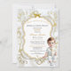 Baby boy in white suit. Invitation background is white satin, gold filigree, a gold and silver glitter frame and bow embellishment. Back is adorned with gold flower pattern & gold ribbon on a white satin background.