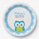Adorable baby boy shower paper plates featuring a smiling big eyed Owl.