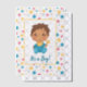 Cute cartoon baby dressed in a blue jumpsuit with a yellow bib holding a baby rattle.