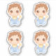 Cute cartoon baby dressed in a blue jumpsuit with a yellow bib holding a baby rattle.
