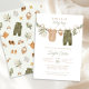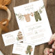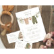 This boho design features a clothesline adorned with adorable baby clothes, a stuffed toy, and dried flowers. The neutral colour palette of sage green, beige, and brown adds to the bohemian vibe, perfect for a chic and stylish baby shower. The back of the invitation showcases matching watercolor baby clothes and accessories, completing the look. Fully customisable text allows you to personalise every detail for your special event.