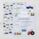 This cute baby boy baby shower invitation baby announcement design features a blue cartoon transport vehicle design, with cars, pickup trucks, trains, aeroplanes, diggers, tractors and helicopters. There is also space for you to add the parent’s names and all the information you need to share for your party.