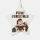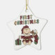 An adorable baby's first Christmas ornament featuring a baby boy in a red suit and stocking cap and multicolors text that reads "First Christmas"!