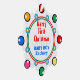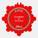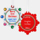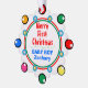 Merry First Christmas written in snowcapped red typography against white background. Baby Boy NAME written in bright blue text. Backside is solid red colour with text in white Love, Grandma & Grandpa YEAR (personalise with any names). Look of festive snowflake colourful lights ornaments in red, green, blue, orange, yellow, pink on outside border. Inside double rings in festive green and red with smaller geometric circles in silver and gold outlined in sky blue. Original Artwork Design by TamiraZDesigns.