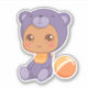 Cute cartoon baby dressed in a purple bear jumpsuit with a yellow bib decorated with a tiny star. Bright ball is resting to the side.