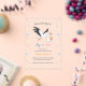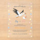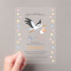 A stork is carrying a baby in a bundle. Lovely and original gender reveal invitation.