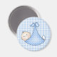 A pale blue checked background with a baby boy swaddled in a blue blanket on customisable baby buttons and magnets, perfect for baby showers or announcing the new baby boy arrival.