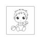 Cute cartoon baby boy dressed in a jumpsuit with a bib decorated with a tiny star. Toy ball is resting to the side.