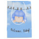 Baby boy hanging on clothesline with cloud and blue sky background.