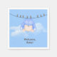Baby boy hanging on clothesline with cloud and blue sky background.