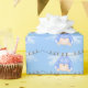 Baby boy hanging on clothesline with cloud and blue sky background.