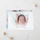 Photo baby boy birth announcement card to introduce your beautiful newborn baby son. The front includes your baby photo, soft blue script name and birth stats. The reverse has two further photos and includes a white script message and family or parents name(s) set on a soft blue background. Designed by Thisisnotme©