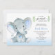 Cute pastel watercolor elephant in blue, grey and green for boy baby shower invite.
